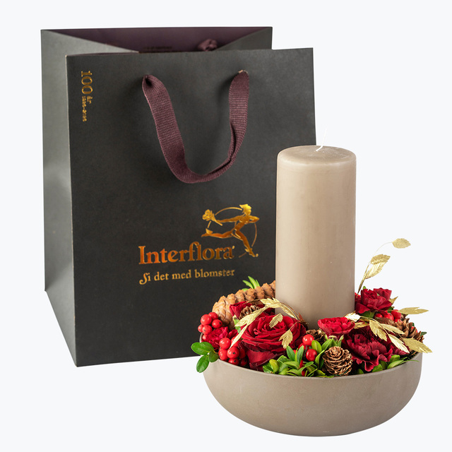 Vakker dekorasjon med lys som stråler julestemning. Enkelt å motta siden den kan settes rett på bordet.