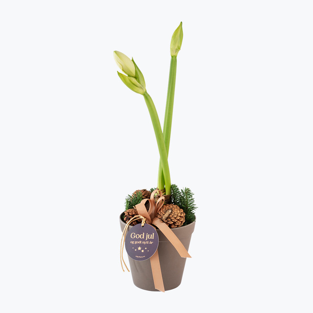 Hvit amaryllis pyntet til julefest i en pen diskret potte. Å følge utviklingen fra knopp til en Amaryllis som står i fullt flor kan oppleves som rene julemagien! En holdbar, lettstelt hilsen som er spesielt fin å sende i adventstida.